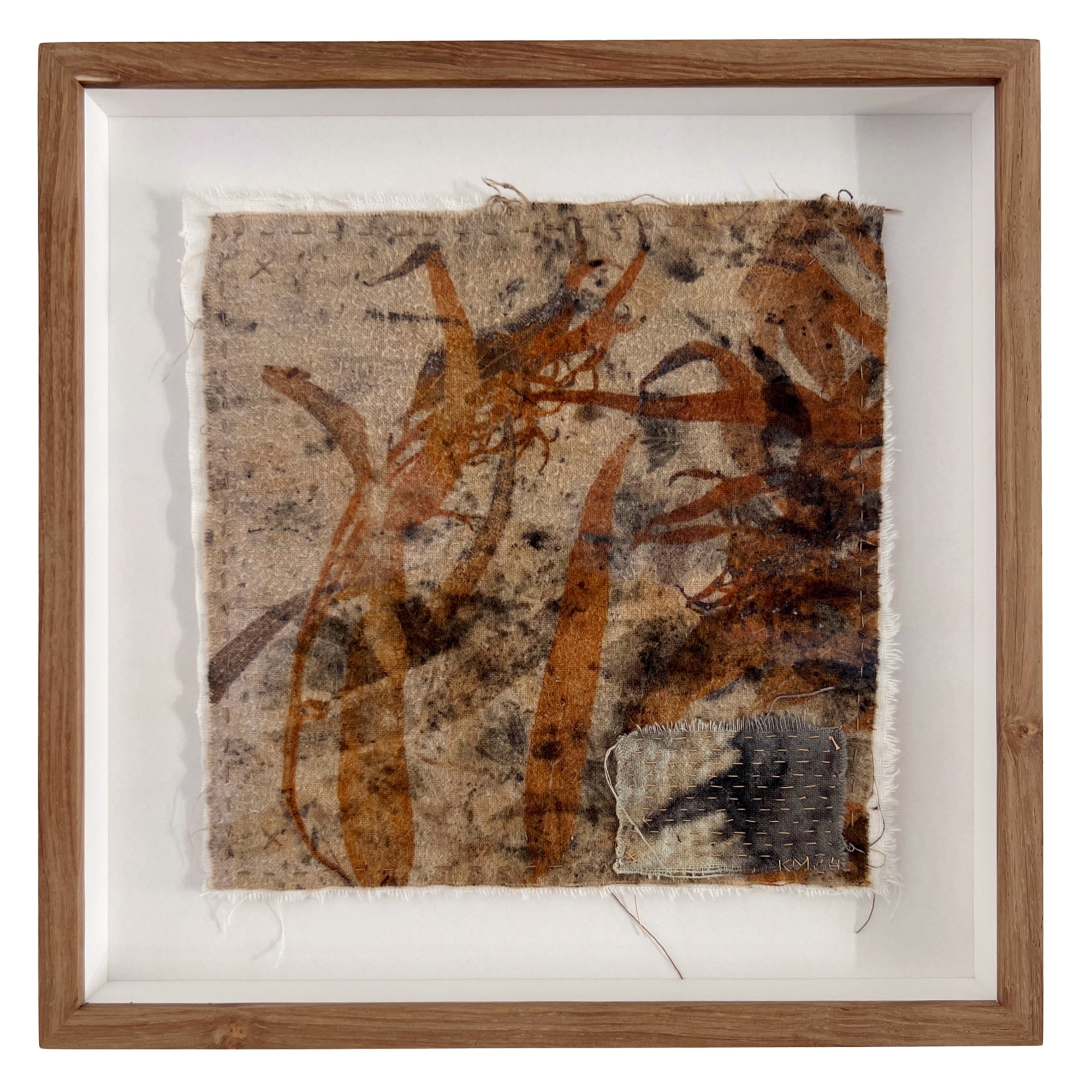 Natural mark making and stitch on hemp linen and cotton isolation cloth, with vintage thread.