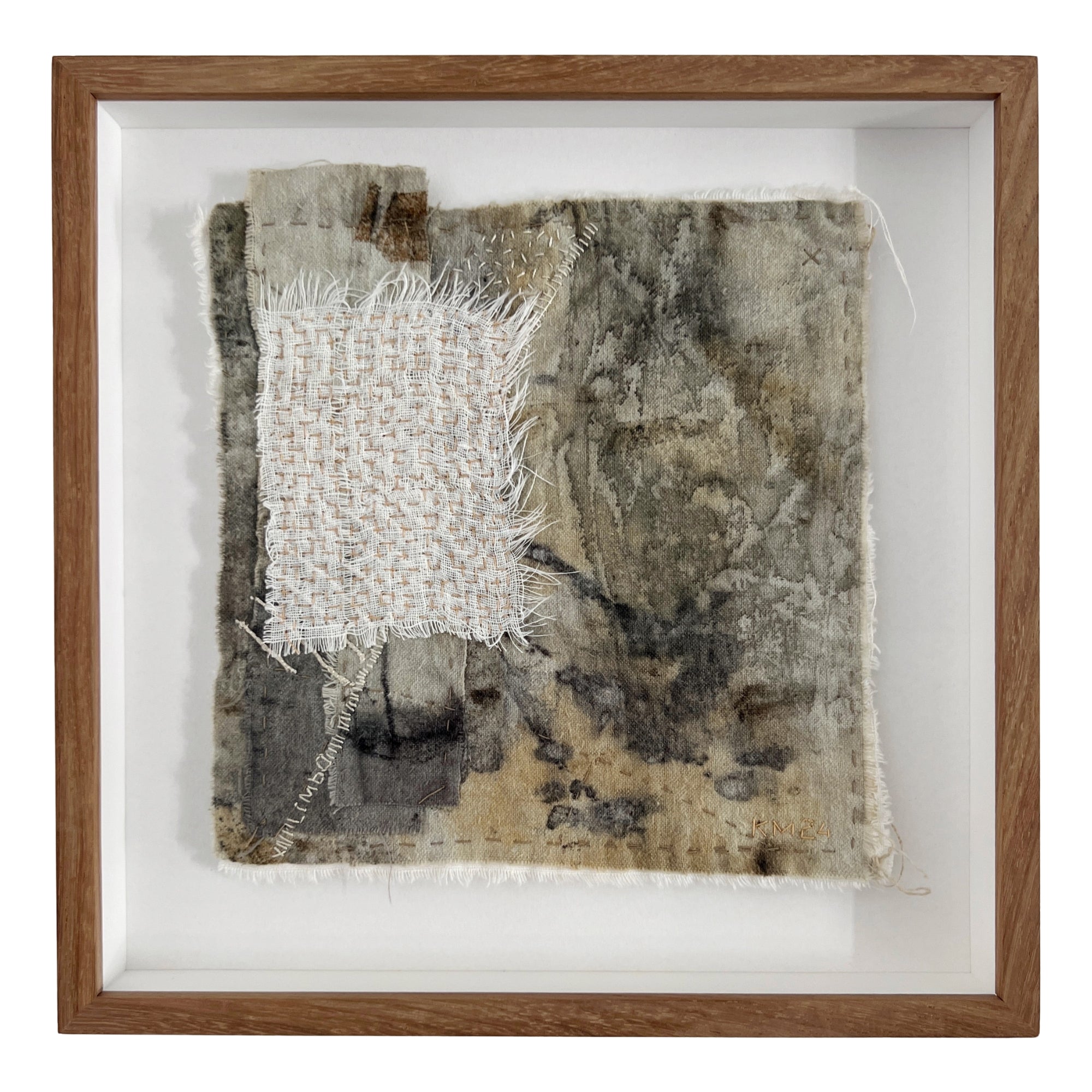 Natural mark making and stitch on hemp linen and cotton isolation cloth, with vintage thread.
