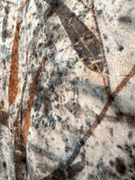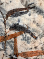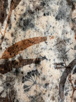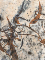 The botanical contact print method has been used to print rusty orange, aubergine and charcoal coloured foliage, directly off the leaves and plant pigment innate in the cell structure of the plants. No chemicals, ink or dye is used in the process. This is a unique artwork.