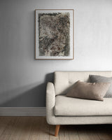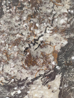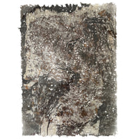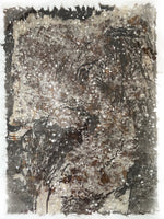 Single layer woodblock print over Japanese hemp lace paper textile, printed with natural pigments, directly off locally foraged plants. Each piece in the varied edition features the same woodblock print in a very dark French navy, abstract but reminiscent of a woman's body. The underlying botanical print is varied from one to the next in the varied edition. Each is a unique artwork.